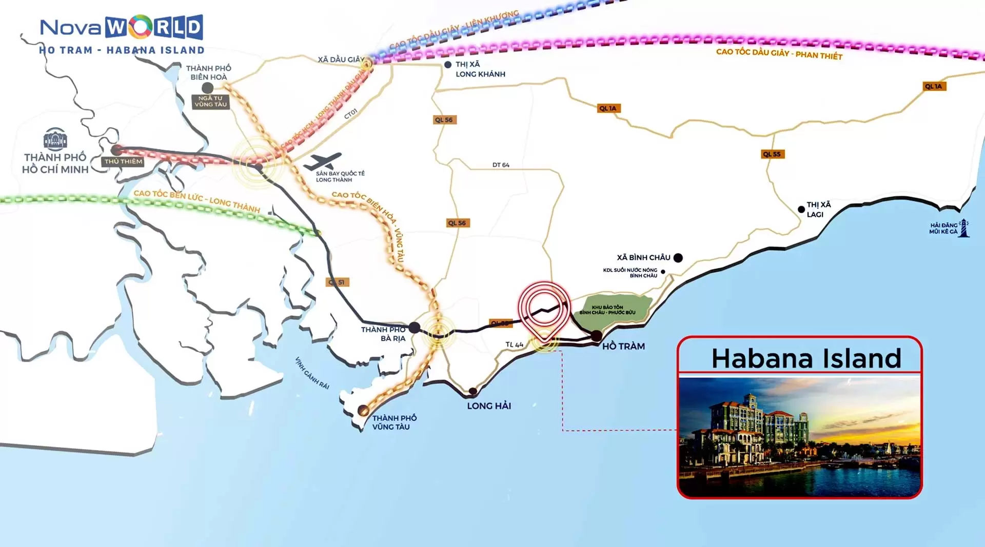 Với vị trí một mặt là sông Ray, một bên mặt biển Lộc An, từ Habana Island Novaworld Hồ Tràm cư dân chỉ mất vài bước chân để hòa mình vào biển, đồng thời dễ dàng di chuyển tới các điểm du lịch nổi tiếng chỉ trong ít phút như Hồ Cốc, Bình Châu, Phước Hải, Long Hải, Vũng Tàu…