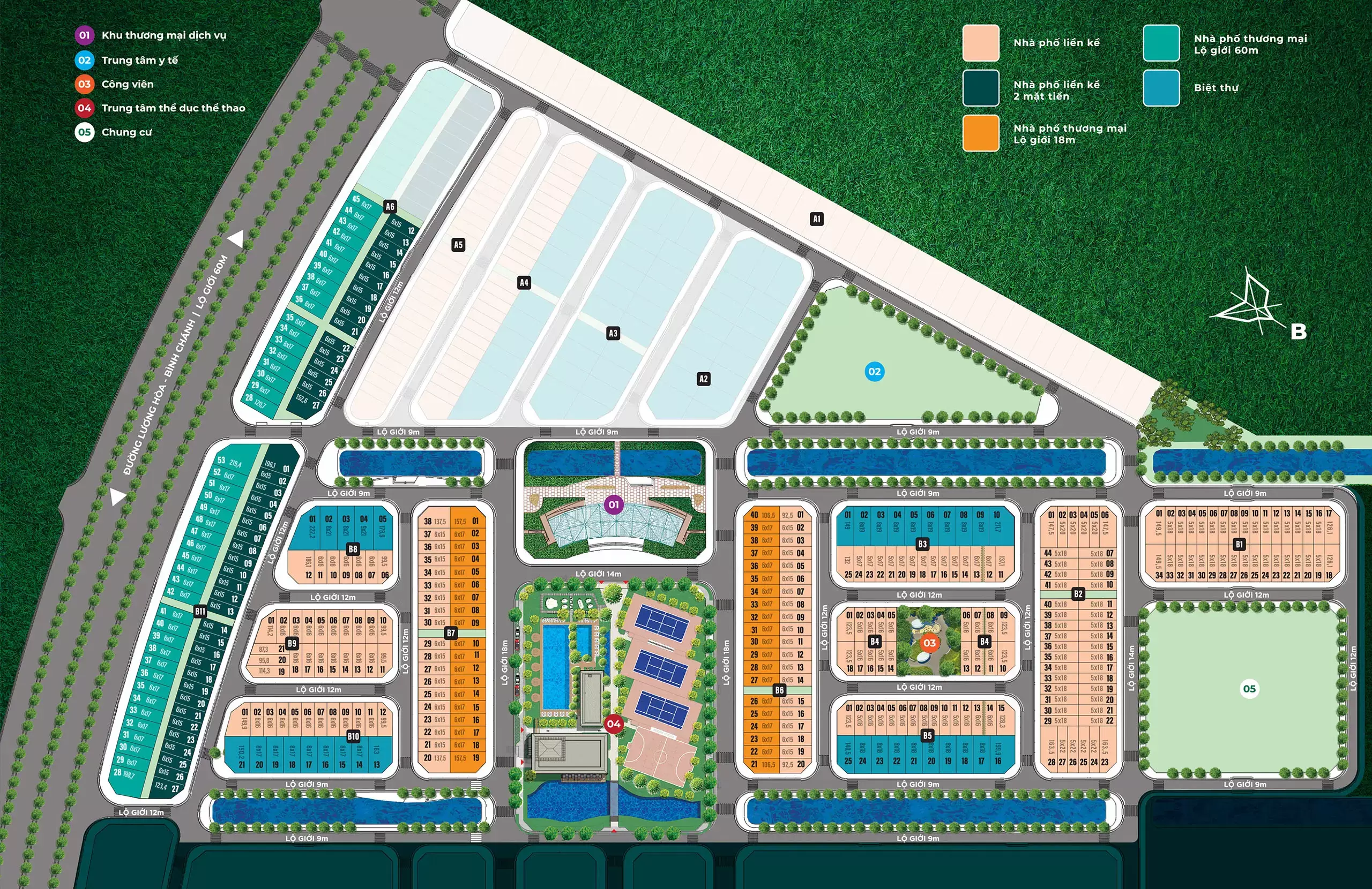 Đại lộ Thương mại Sầm uất: Trung tâm Thương mại (3 ha) và chuỗi Shophouse được quy hoạch tập trung ngay mặt tiền Đại lộ Lương Hòa – Bình Chánh (lộ giới 60m), tạo thành trục giao thương sôi động, đáp ứng nhu cầu vui chơi - mua sắm - giải trí liền mạch.