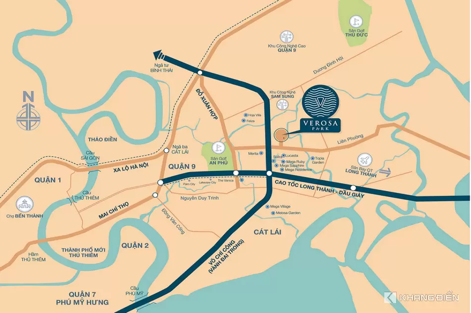 Verosa Park Khang Điền tọa lạc tại đường Liên Phường, Phường Long Trường, Hồ Chí Minh. Đây là vị trí chiến lược, cư dân dễ dàng di chuyển về trung tâm thành phố, các khu đô thị phía Đông Sài Gòn. Thời gian gần đây, TP. HCM tập trung xây dựng phát triển hạ tầng Khu Đông đặc biệt là Quận 9. Với việc đưa vào sử dụng tuyến cao tốc Long Thành – Dầu Giây, hoàn thiện vòng xoay Mỹ Thủy giúp cư dân nơi đây thuận tiện trong việc đi chuyển.